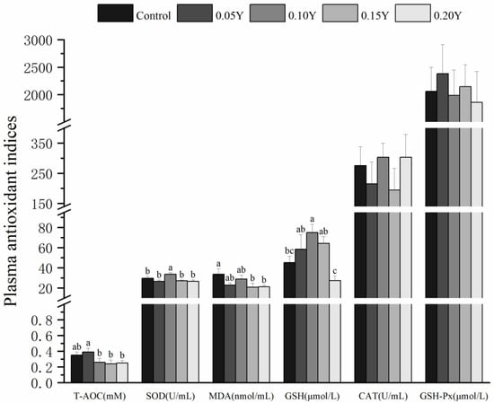 The results of the antioxidant indices analysis of the five groups are shown in Figure 1. Superoxide dismutase (SOD) activity and glutathione (GSH) content were the highest in the 0.10Y group (p < 0.05) and showed an initial increasing and subsequent decreasing trend. The total antioxidant capacity (T-AOC) was the highest in the 0.05Y group (p > 0.05). The plasma malondialdehyde (MDA) content was significantly lower in the 0.15Y and 0.20Y groups (p < 0.05), with a negative association with dietary YPS concentration. However, dietary YPS supplementation did not have any significant effect on catalase (CAT) and glutathione peroxidase (GSH-Px) activities (p > 0.05).