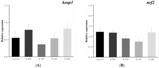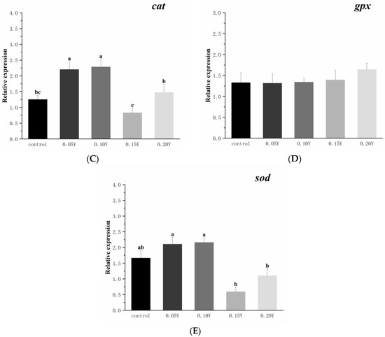Figure 2 illustrates the hepatic antioxidant genes’ relative expression. Notably, the 0.05Y and 0.10Y groups exhibited a significant increase in cat mRNA expression (p < 0.05). Additionally, the sod mRNA expression was the highest in the 0.05Y and 0.10Y groups (p > 0.05). However, none of the other three genes was significantly affected by dietary YPS supplementation (p > 0.05).