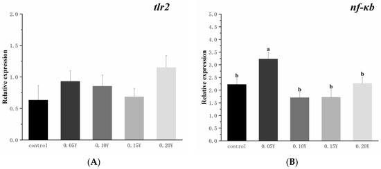Figure 3 illustrates the hepatic immune-related genes’ relative expression. nf-κb mRNA expression was the highest in the 0.05Y group (p < 0.05), and the trend of rela mRNA expression was similar to it (p > 0.05). The il-10 and il-8 mRNA expressions were the highest in the 0.05Y and 0.20Y groups (p < 0.05). However, the tlr2 mRNA expression was not significantly affected by dietary YPS supplementation (p > 0.05).