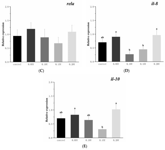 Hepatic immune-related genes’ expression (n = 9): (A) tlr2, (B) nf-κb, (C) rela, (D) il-8, and (E) il-10. Different lowercase letters on the bar graph indicate significant differences (p < 0.05); no labeling indicates no significant difference.