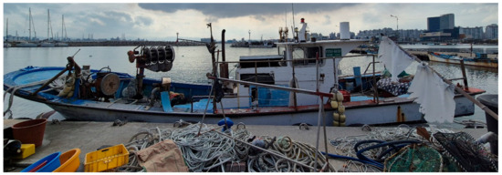 This study focused on occupational injuries occurring during fishing operations using trap boats (Figure 1). The selection of this focus is based on several reasons. A review of industrial injury compensation approval data for fishing operations over the past five years (2016–2020) revealed that accidents involving trap boats ranked third among all types of fisheries yet had the highest fatality rate per incident (Table 1) [14,17]. Additionally, despite variations in fishing practices between countries, trap fishing is a widely employed method globally, enhancing the relevance and applicability of the research process and findings.