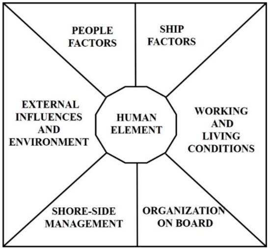 It is widely acknowledged that most maritime accidents are caused by the human element, with preventive measures typically focusing on crew education and training. However, the IMO has determined that the human element involves not only individual human issues but also a complex interplay of multiple factors. It classified the factors influencing the human element into six categories for maritime accident investigations: People factors, Organization on board, Working and living conditions, Ship factors, Shore-side management, and External influences and environment [22]. Figure 2 illustrates the six factors related to the human element as proposed by the IMO.