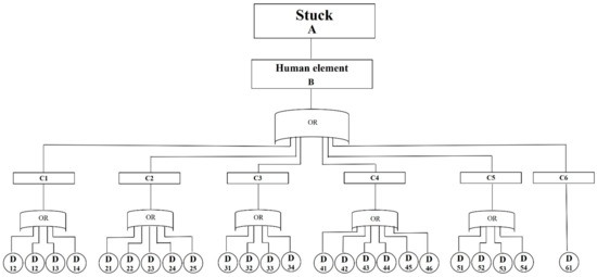 The primary objective of risk estimation is to clearly identify the causes and underlying factors contributing to the Stuck injury, which was determined to be the highest risk injury type in Step 1. As outlined in Section 2.1.3, it was assumed that most maritime accidents are caused by the human element. Thus, the human element was identified as the main cause of Stuck injuries. The six factors influencing the human element, as proposed by the IMO (People factors, Organization on board, Working and living conditions, Ship factors, Shore-side management, External influences, and environment), were selected as the primary indirect factors. Additionally, the sub-factors presented in Figure 3 were identified as secondary indirect factors. Using the FTA technique, the study performed a risk estimation to quantitatively analyze the relationship between accident patterns and their underlying factors.