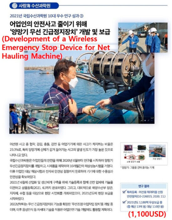 The National Institute of Fisheries Science, a government agency in Korea, developed an “Accident Prevention Manual” to prevent injuries on fishing vessels (Figure 6). The total cost for its development, from research to production, was approximately $150,000. Assuming a printing cost of $15 per copy and distribution to all 6179 insured fishermen, the total cost would be $92,685, resulting in a benefit of $161,873. Therefore, RCO2 is deemed effective (Table 19).