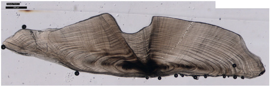 Sagittal otoliths were removed, cleaned, and dried prior to being embedded in resin and transversely sectioned (250–300 µm). Sectioned otoliths were mounted on glass slides, viewed and photographed using a microscope with transmitted lighting. Otoliths were read by counting the number of opaque zones on the dorsal side of the otolith and otolith margin classified as opaque, narrow, or wide (Figure 4). As the sampling dates coincided with the increment formation period, count data were adjusted by 1+ when an individual possessed a wide or opaque margin.
