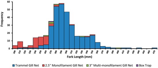 During the 2023 survey, 378 perch were captured, with 191 fish tagged and released, while 146 were processed and released untagged. Trammel gillnet sets (4″ inner and 24″ outer mesh) captured the majority of fish (82%), followed by the 2.5″ monofilament gillnet (16%), the 3″ multi-monofilament gillnet (0.53%), and the box traps (0.26%) (Figure 5). Attempts to capture young of the year using fyke nets and box traps despite setting for a total of 274 net hours were unsuccessful. Similarly, the rod and line fishing effort did not capture any estuary perch (Figure 5).