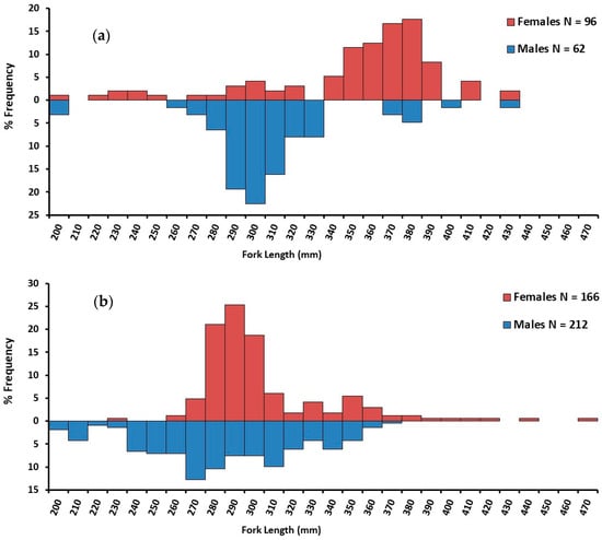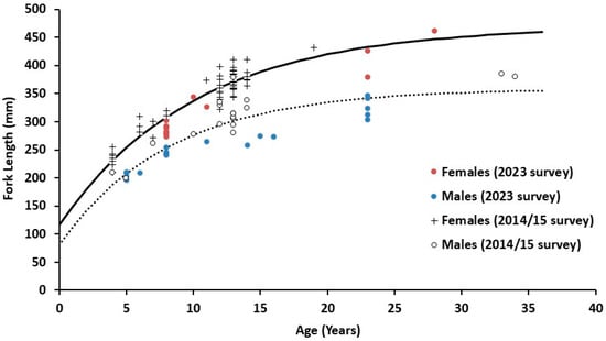 Size at age data indicated that sex-specific variation in growth is evident, with females being larger than males at the same age. Data from both surveys were pooled and plotted on the same axes (Figure 11). Analysis of residual sums of squares test on sex-specific growth models from pooled data confirmed a significant difference (p < 0.001) in growth between sexes, with the Von Bertalanffy growth parameters being L∞ = 469 cm FL, k = 0.10, and t0 = −2.91 for females and L∞ = 359 cm FL, k = 0.12, and t0 = −2.11 for males (Figure 11).