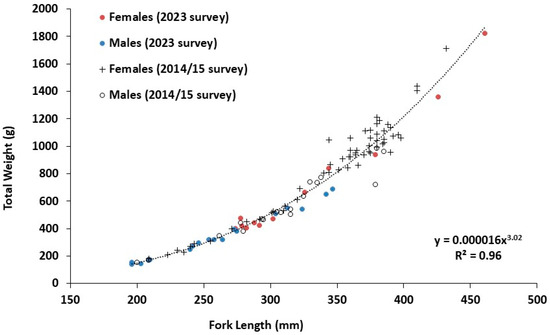 Length and weight of all estuary perch caught in the Arthur River, Tasmania, separated by sex comparing the 2014/15 and 2023 surveys. The length–weight trendline is pooled data with sex and both surveys combined. Survey from 2014/15 N = 76; survey from 2023 N = 31.