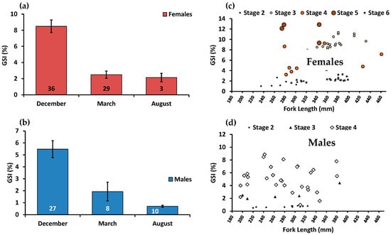 Sex-specific mean seasonal gonadosomatic indices (±95% CI) (a,b) and sex-specific scatterplots for reproductive stage, gonadosomatic index, and fish size using pooled data from both surveys (c,d). Values in bar graphs indicate monthly N values.