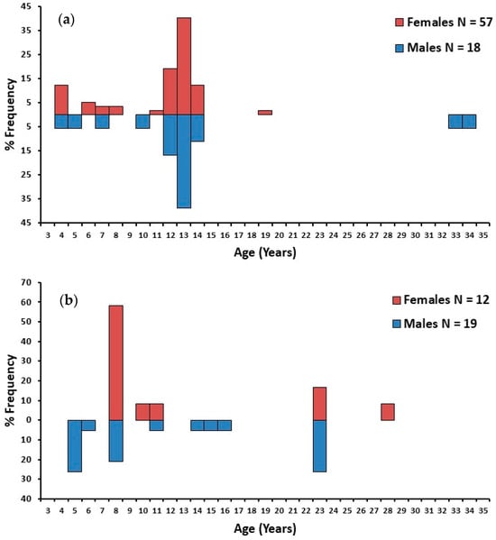 - Wearmouth, V.J.; Sims, D.W. Chapter 2 Sexual Segregation in Marine Fish, Reptiles, Birds and Mammals: Behaviour Patterns, Mechanisms and Conservation Implications. In Advances in Marine Biology; Academic Press: Cambridge, MA, USA, 2008; Volume 54, pp. 107–170. [Google Scholar]