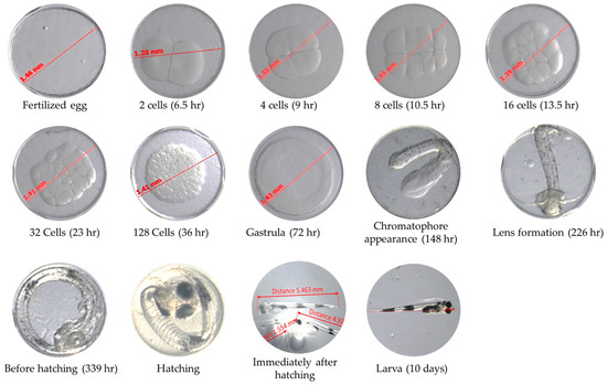 The development of the embryos of the walleye pollock is shown in Figure 1. The average diameter of 3000 embryos was 1.43 ± 0.056 mm. Embryos went through the cleavage stage for up to 52 h post-fertilization (hpf) and reached the gastrula stage at 70.5 hpf. Chromophores were observed at 148 hpf, lenses formed at 226.5 hpf, and the pre-hatching stage was reached at 339 hpf. After hatching, the fish fed on egg yolk for 3–4 days and then began to consume rotifers, B. plicatilis.