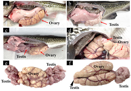 Mature walleye pollock gonads are displayed in Figure 2a,b.