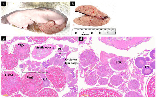 Morphological characteristics and histological characterization of walleye pollock with abnormal ovary. (a) Morphological characteristics of gonads of walleye pollock hatched in January 2022. (b) Abnormal mature ovary. (c) Histological characterization of gonadal tissues from abnormal immature walleye pollock hatched in January 2022. (d) Primordial germ cells (PGC) can be observed in the dotted box in panel (c). PG indicates primary growth oocyte, CA indicates cortical alveolar oocytes, Vtg2 indicates secondary vitellogenic oocyte, and Vtg3 indicates tertiary vitellogenic oocyte.