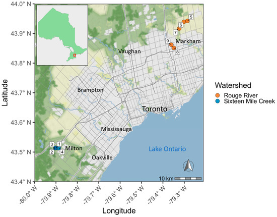 Fishes for this study were sampled at nine sites in the Greater Toronto Area in Ontario, Canada in June 2016. Sample sites were small streams (<15 m wide) within the Sixteen Mile Creek and Rouge River watersheds (Figure 3). Each site was a 40–m section of the stream, isolated at each end using block-nets prior to sampling. Fishes were collected using three-pass backpack electrofishing (see [27] for details).