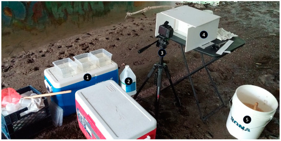 Captured fishes were immediately placed in aerated buckets; individuals that were too large to fit into the fish viewer were identified and released without being photographed. Captured fishes were photographed in the field using a portable setup, including a folding table with adjustable legs, a digital camera (Nikon® Coolpix L330, Tokyo, Japan) attached to a tripod with adjustable legs, and a Plexiglas® fish viewer (a narrow fish tank with dimensions of 30 cm long × 20 cm high × 4 cm wide) to hold fishes for photography (Figure 4). All surfaces of the viewer, excluding the front panel, were made white and opaque (either by using white thermoplastic, or by covering the transparent surfaces with white duct tape) to minimize reflection and irregularities in lighting. The viewer was filled with clear water collected from the sample site, until the water level in the viewer reached approximately 5 cm from the top. After the viewer was filled, a three-sided covering of white foam board (two side panels and one lid) was affixed to the viewer using tape, to provide additional protection from light disturbance to improve image quality. A small piece of tape was affixed externally to the centre of the front panel of the viewer, to provide a focal point for the camera. A small waterproof label, with a unique identification number, was placed in a corner of the viewer, to provide an identification tag for each subsample. Flash photography was used, with the camera exposure being adjusted as necessary to compensate for light levels in the surrounding environment.