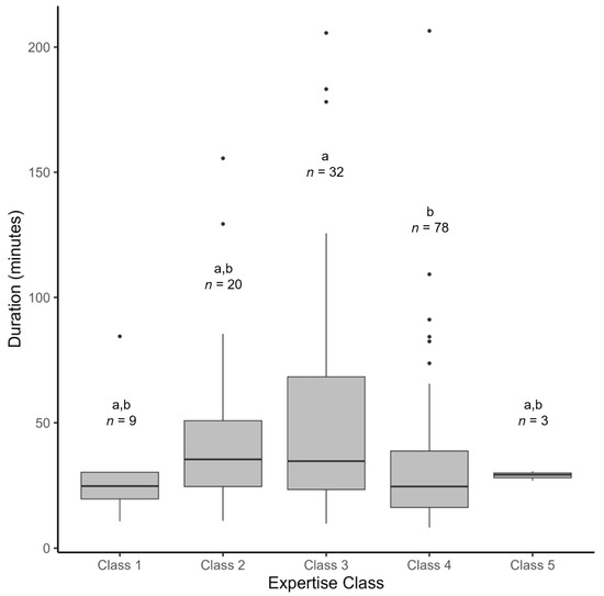 Boxplots of time to complete an identification survey (“duration”) by expertise class. Letters represent results of post hoc Tukey test (differing letters indicate statistically significant differences between groups, where α = 0.05), with sample sizes for each class displayed below.
