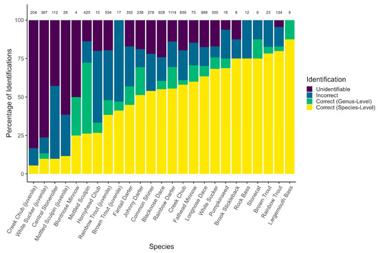 The weighted mean species-level CIR across all species was 49.7%, with an additional 11.5% (total of 61.2%) of fishes being correctly identified to the genus level. Species-level CIRs varied significantly by species and life stage (Table 2), ranging from 5.4% for juvenile creek chub (Semotilus atromaculatus) to 87.5% for largemouth bass (Micropterus salmoides) (Figure 6). Juveniles and species with cryptic identification features (e.g., central stoneroller (Campostoma anomalum), cartilaginous ridge on lower jaw; mottled sculpin (Cottus bairdi), presence of palatine teeth [39]) generally had significantly lower species-level CIRs compared to larger and more morphologically distinct species (e.g., rainbow trout (Oncorhynchus mykiss), white sucker (Catostomus commersonii); Table S3). Genus-level CIRs did not follow the same rank order as species-level CIRs, as some species with cryptic identification features (e.g., bluntnose minnow (Pimephales notatus), variation in scale size [39]; mottled sculpin) were correctly identified to the genus level (i.e., species-level identification or genus-only) at substantially higher rates than to the species level (Figure 6). Cases where species- and genus-level CIRs were equal for a given species (e.g., central stoneroller) occurred due to a lack of a genus-level identification option for that species in the survey because there is only one species in the genus in Ontario.