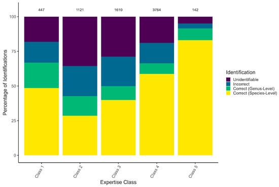Percentages of total identifications for each respondent expertise class correct to the species level, correct to the genus level, incorrect (i.e., respondent selected a different taxon) or labeled “unidentifiable” by survey respondents. Total number of identifications made by each class are shown above each bar.