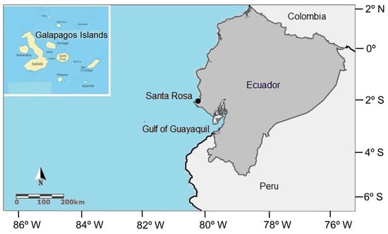 - Martínez-Ortiz, J.; García-Domínguez, M. Guía de Campo: Condrictios del Ecuador. Quimeras, Tiburones Y Rayas; Ministerio de Agricultura, Ganadería, Acuacultura y Pesca (MAGAP), Viceministerio de Acuicultura y Pesca (VMAP), Subsecretaría de Recursos Pesqueros (SRP): Manta, Ecuador, 2013; p. 246. [Google Scholar]