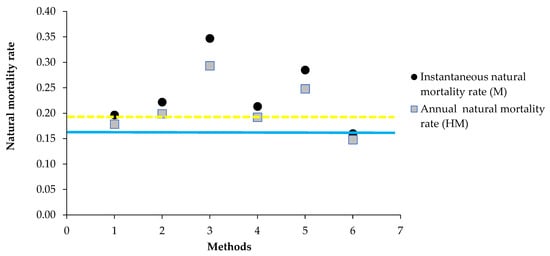The natural mortality rate obtained by the methods initially developed for bony fish and later applied to cartilaginous fish yielded the same results, so they were grouped into one. This is congruent with the findings of Dureuil et al. [], who estimated the methods used in 16 species of bony and 2 cartilaginous fish. They did not find any difference; thus, using any technique was feasible. However, this differs from the theory proposed by Zhou et al. [], who demonstrated that the methods developed for osteichthyes and applied in a group of 15 stocks of 13 shark species in the Western Pacific Ocean (north, center, and south zones) presented higher biases than those applied explicitly for elasmobranchs. Also, the latter authors highlighted the benefits of the empirical methods, given that they are easier to apply, have no cost, and can be adapted to any group of organisms. Furthermore, they recommend using various models to evaluate such population parameters, given that they help decrease the bias of applying only one technique.