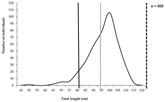 Size–frequency distribution of Pseudocarcharias kamoharai and its reference population parameters. The black vertical line represents the optimal capture average size according to the maximum sustainable yield (Lopt), the grey line is the sexual maturity size of the population, and the dotted line is the asymptotic length of the individuals.