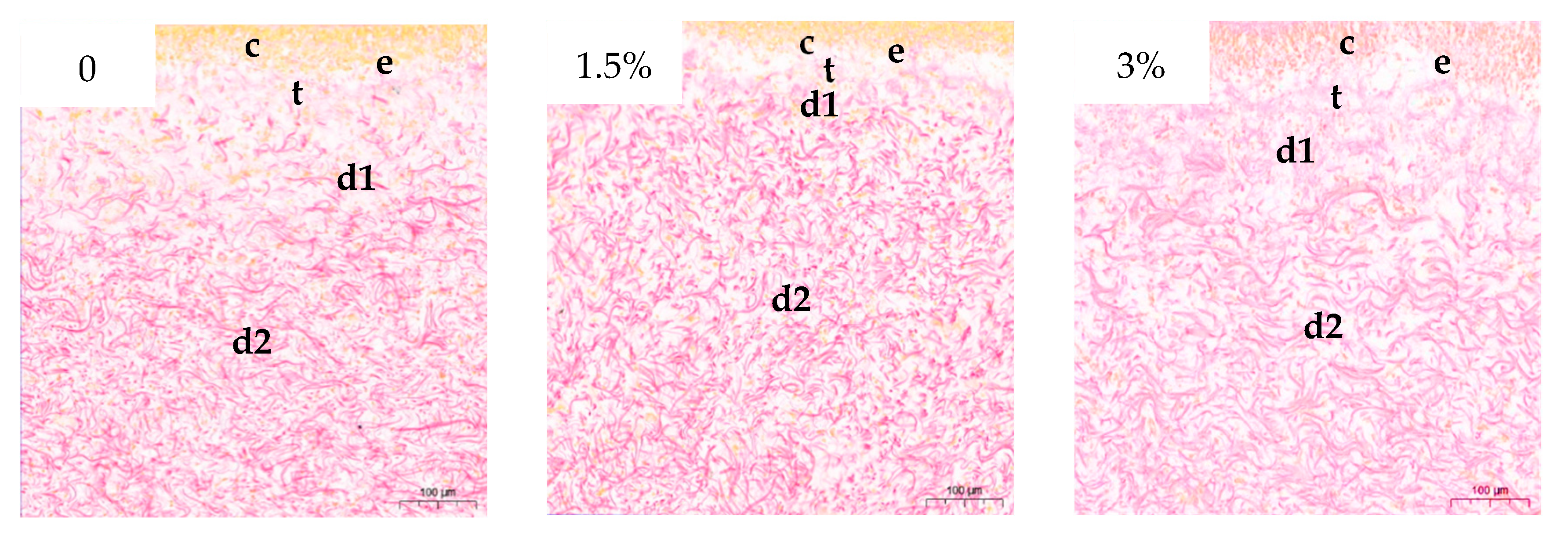 3.2. Collagen Content and Structure