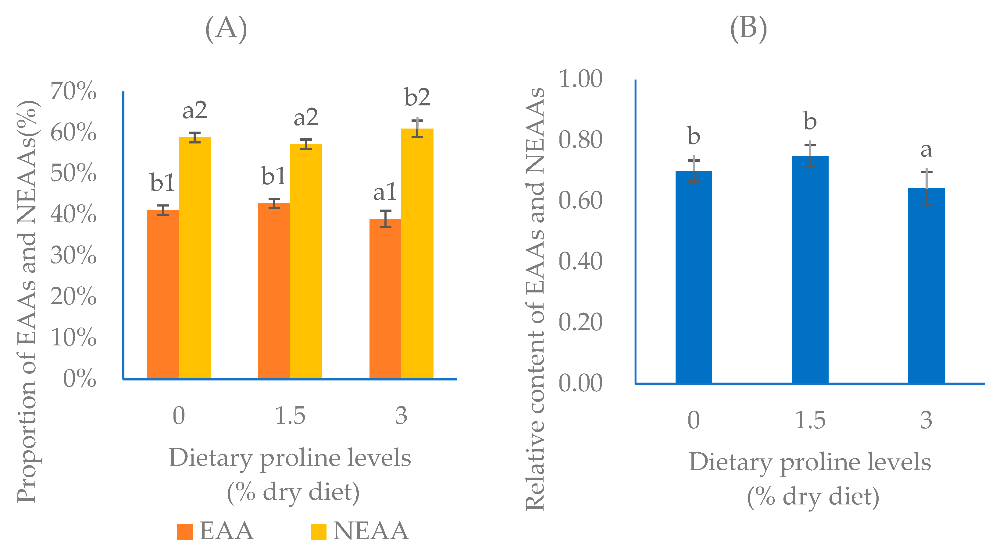 | Amino Acid | Dietary Proline Levels (% Dry Diet) | ||