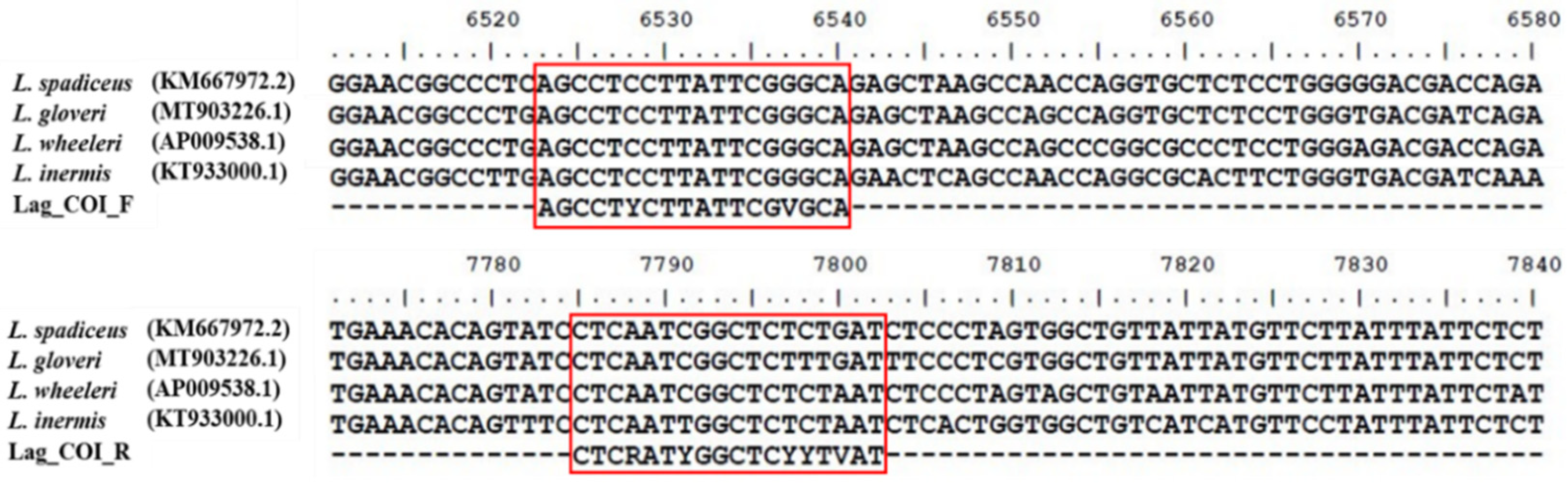 6 | LI_COI_F | ATG GTG TGG GCA ATA ATG GCT | 563 bp | L. inermis |