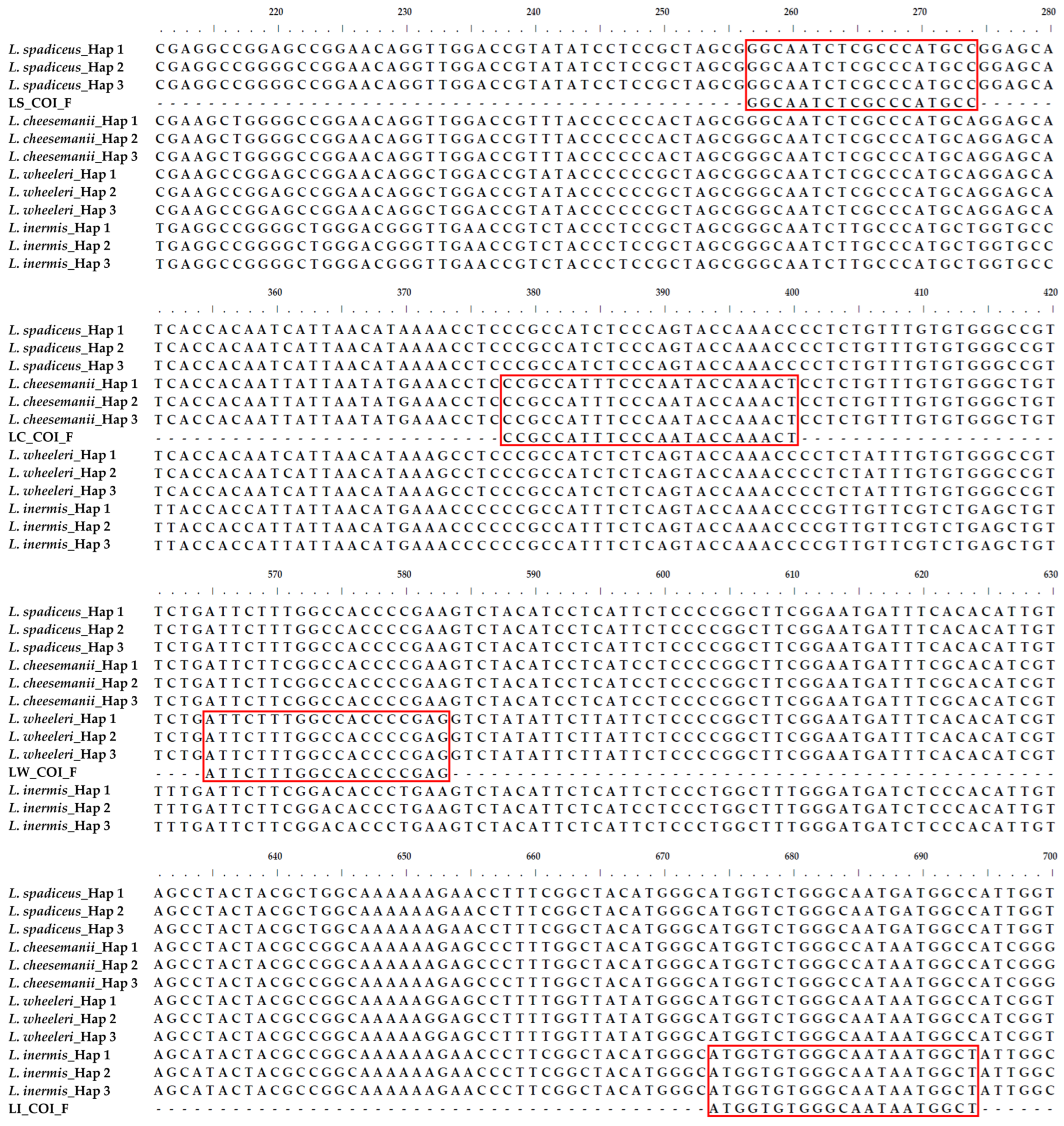 5 | LW_COI_F | ATT CTT TGG CCA CCC CGA G | 672 bp | L. wheeleri |