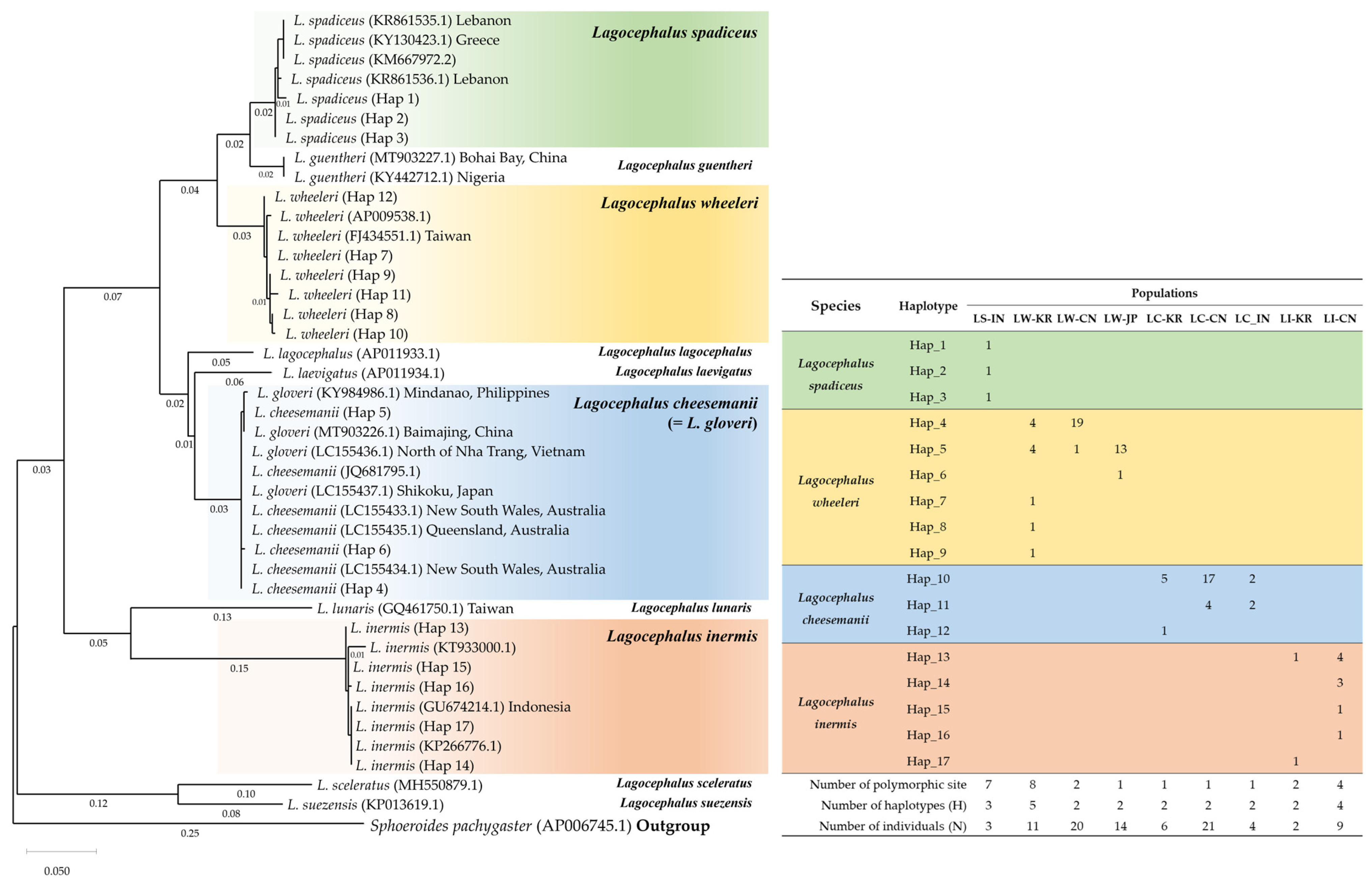 - Matsuura, K. Lagocephalus wheeleri Abe, Tabeta & Kitahama, 1984, a junior synonym of Tetrodon spadiceus Richardson, 1845(Actionpterygii, Tetraodontiformes, Tetraodonidae). Natl. Mus. Nat. Sci. 2010, 46, 39–46. [Google Scholar]