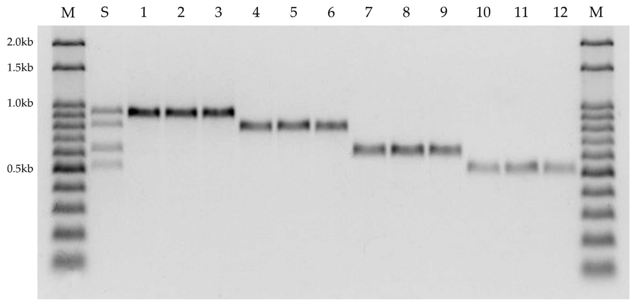 2.6. Specificity and Sensitivity of Multiplex PCR