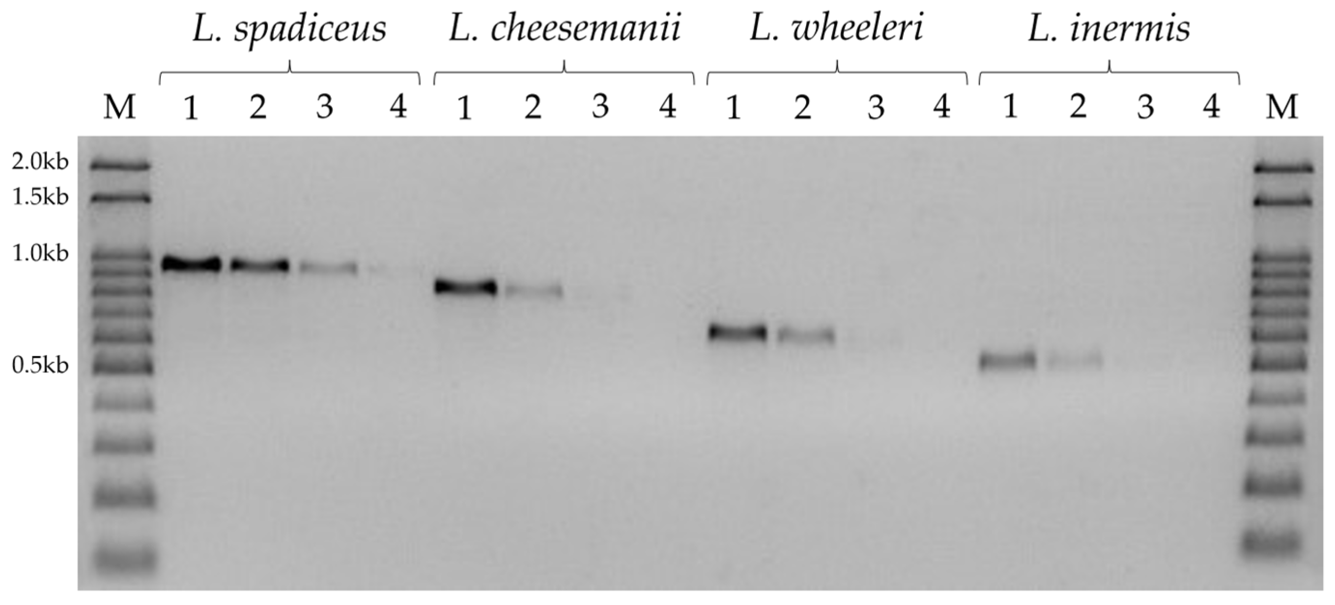 - Sangthong, P.; Ngernsiri, L.; Sangthong, D. Identification of puffer fish of the genus Lagocephalus: L. lunaris, L. spadiceus and L. inermis, using multiplex PCR. Food Biotechnol. 2014, 28, 2016–2231. [Google Scholar]