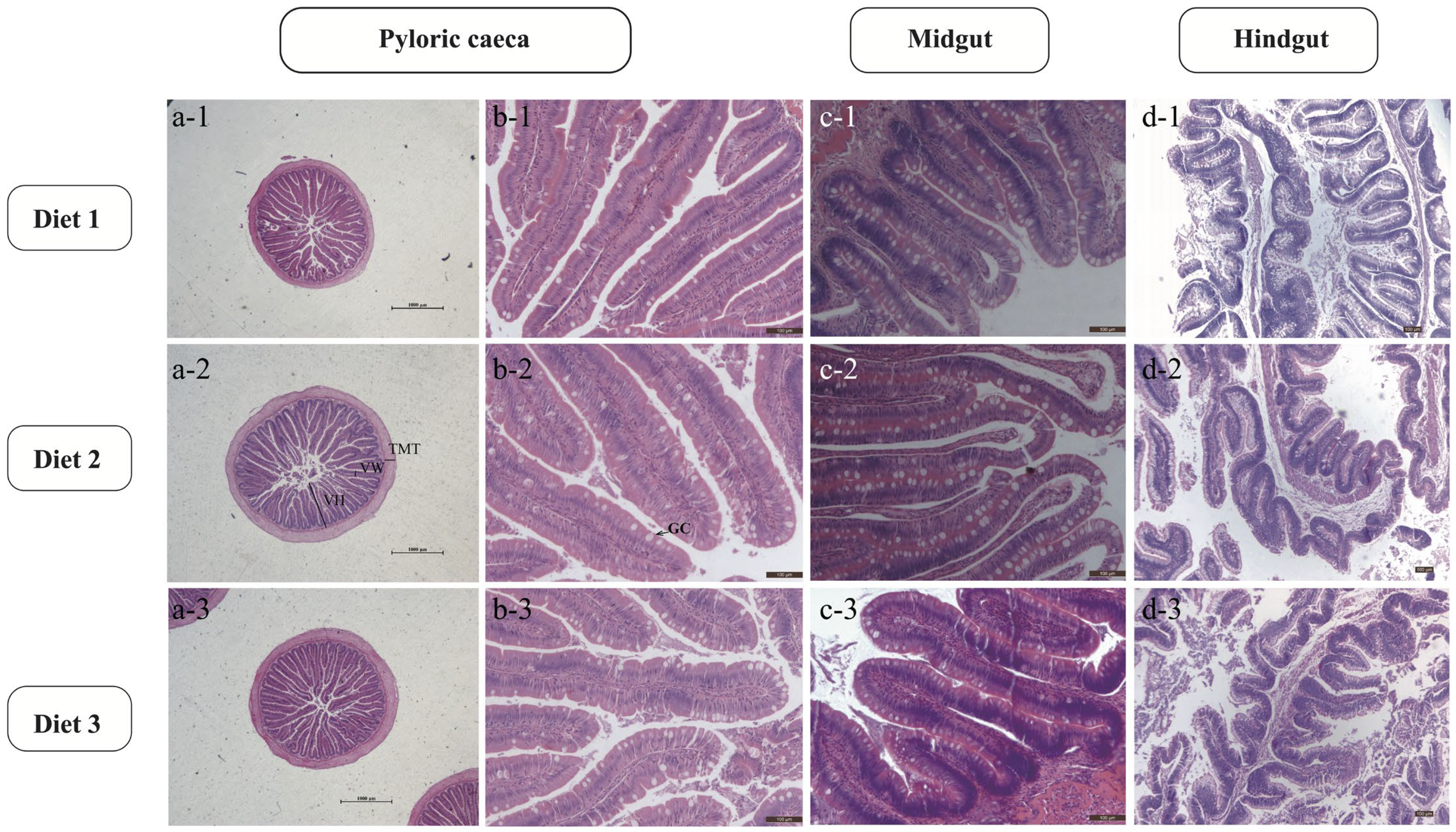 Tunica muscularis thickness (μm) | 208.37 ± 17.90 b | 314.14 ± 20.34 a | 307.83 ± 26.89 a |