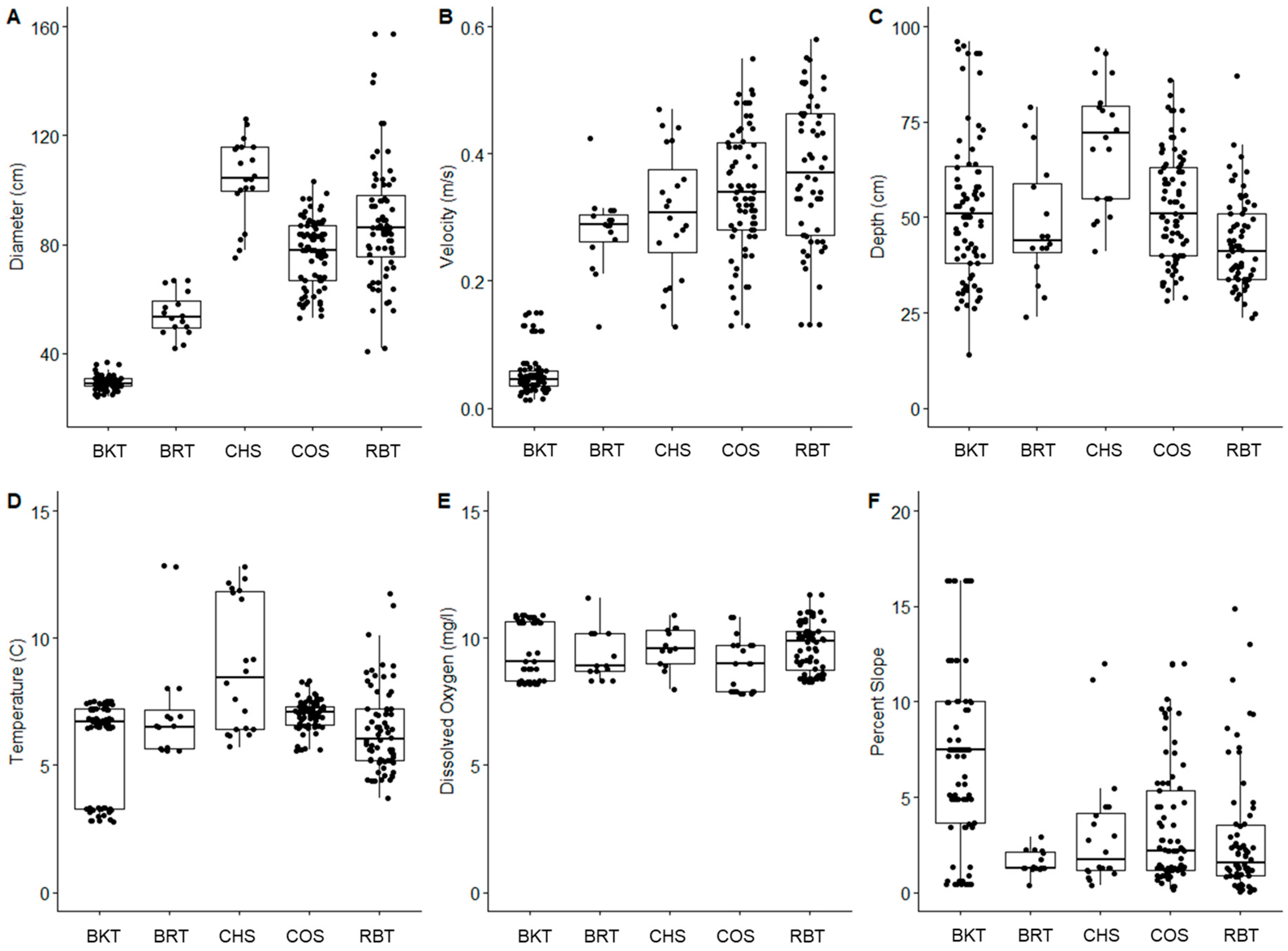 Brook Trout | 80 | Fall | 9.50 ± 1.09, 8.2–10.9 | 8.03 ± 6.28, 0.41–37.98 | 100% Medium Pebbles | 31.25% Yes, 68.75% No |