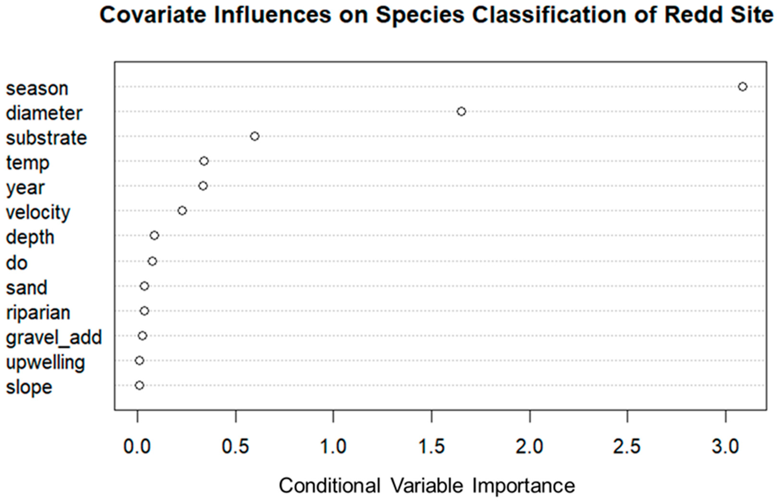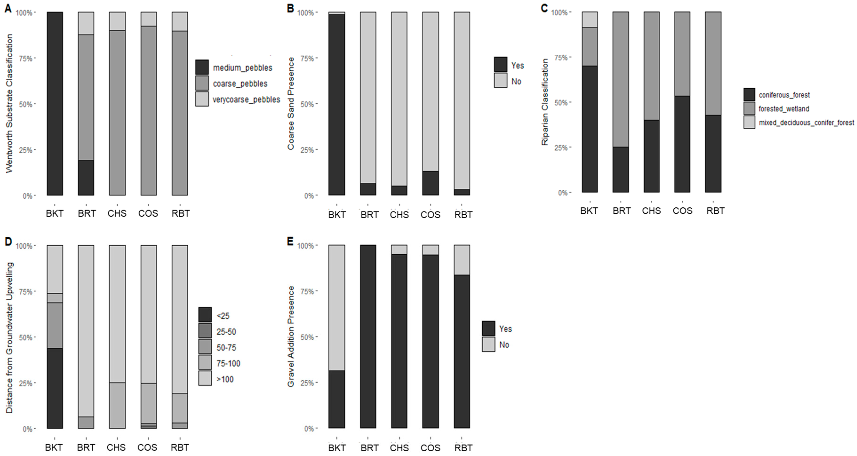 Species | Number of Redds | Season | Coarse Sand Presence in Redd | Riparian Zone Classification | Distance from Nearest Marked Groundwater Upwelling (m) | |