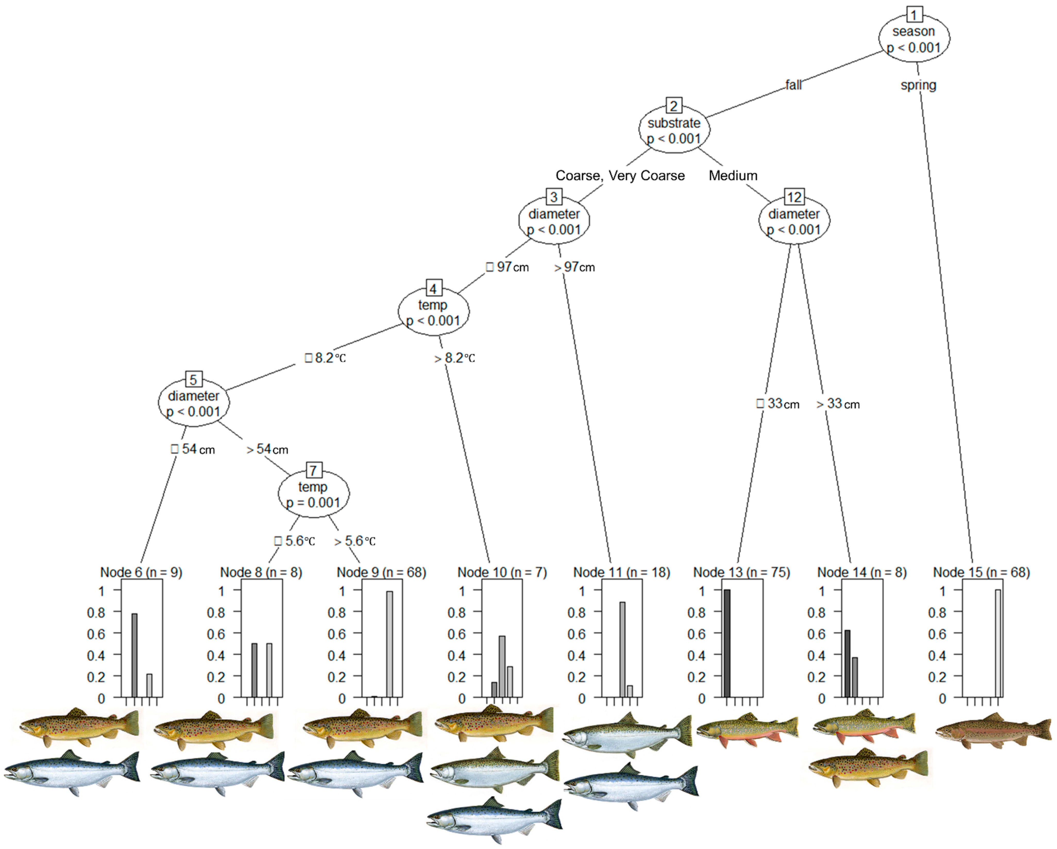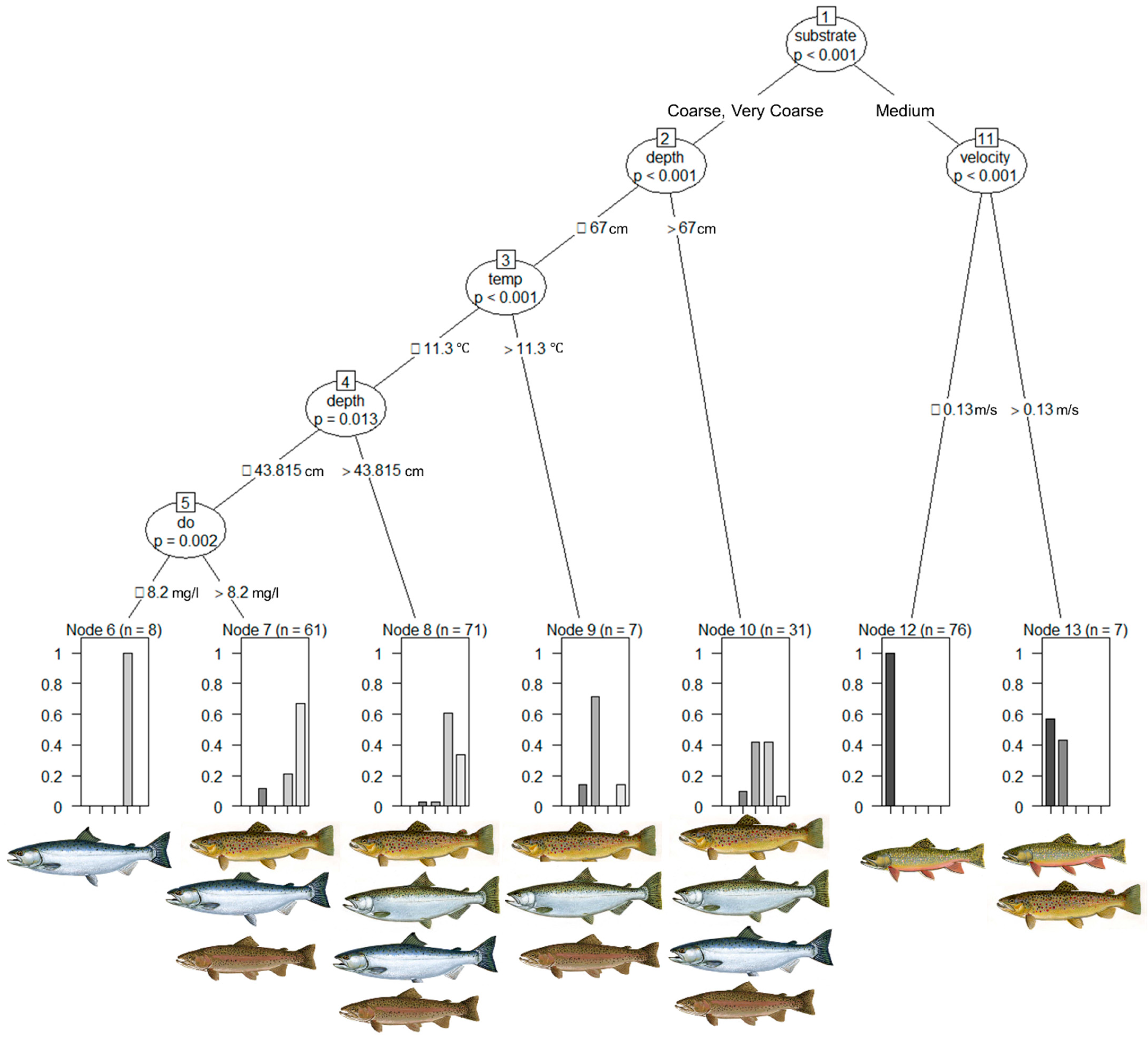5 | Water Depth ≤ 43.82 cm, Dissolved Oxygen—<8.2 mg/L vs. >8.2 mg/L | 16.85 | p = 0.002 | Dissolved Oxygen ≤ 8.2 mg/L, 6 Dissolved Oxygen ≥ 8.2 mg/L, 7 | 8 Coho Salmon 44 Rainbow Trout 13 Coho Salmon 4 Brown Trout | 10.39% of Coho Salmon 64.70% of Rainbow Trout 16.88% of Coho Salmon 25% of Brown Trout |