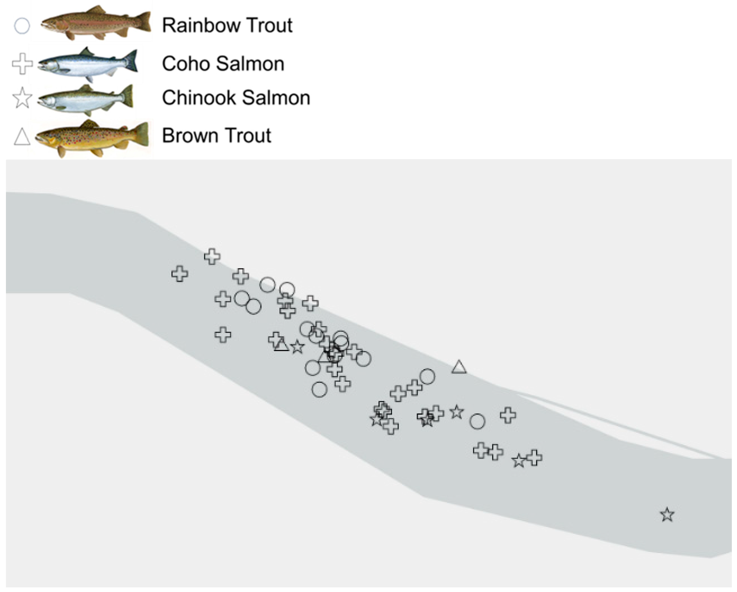 2 | Water Depth—<67 cm vs. >67 cm | 44.73 | p < 0.001 | Water Depth ≥ 67 cm, 10 | 13 Chinook Salmon 13 Coho Salmon 3 Brown Trout 2 Rainbow Trout | 65% of Chinook Salmon 16.88% of Coho Salmon 18.75% of Brown Trout 2.94% of Rainbow Trout |