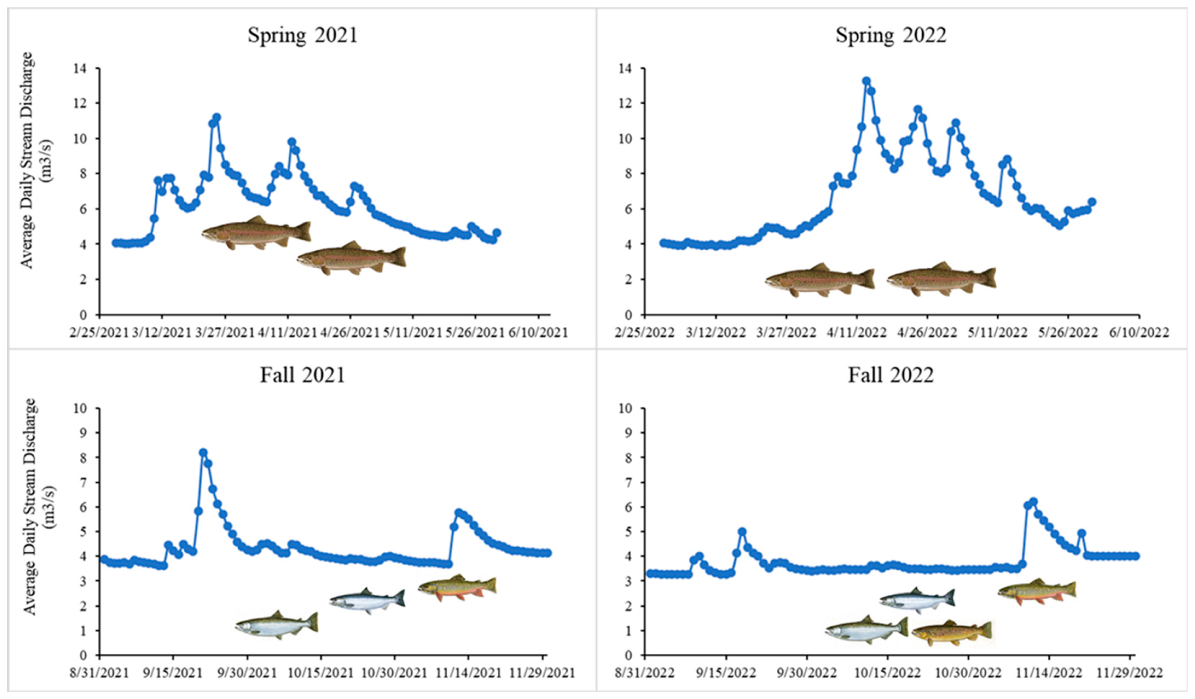 Rainbow Trout | 68 | Spring | 9.66 ± 0.95, 8.26–11.7 | 2.88 ± 3.22, 0.06–14.9 | 89.7% Coarse Pebbles, 10.3% Very Coarse Pebbles | 83.3% Yes, 17.7% No |