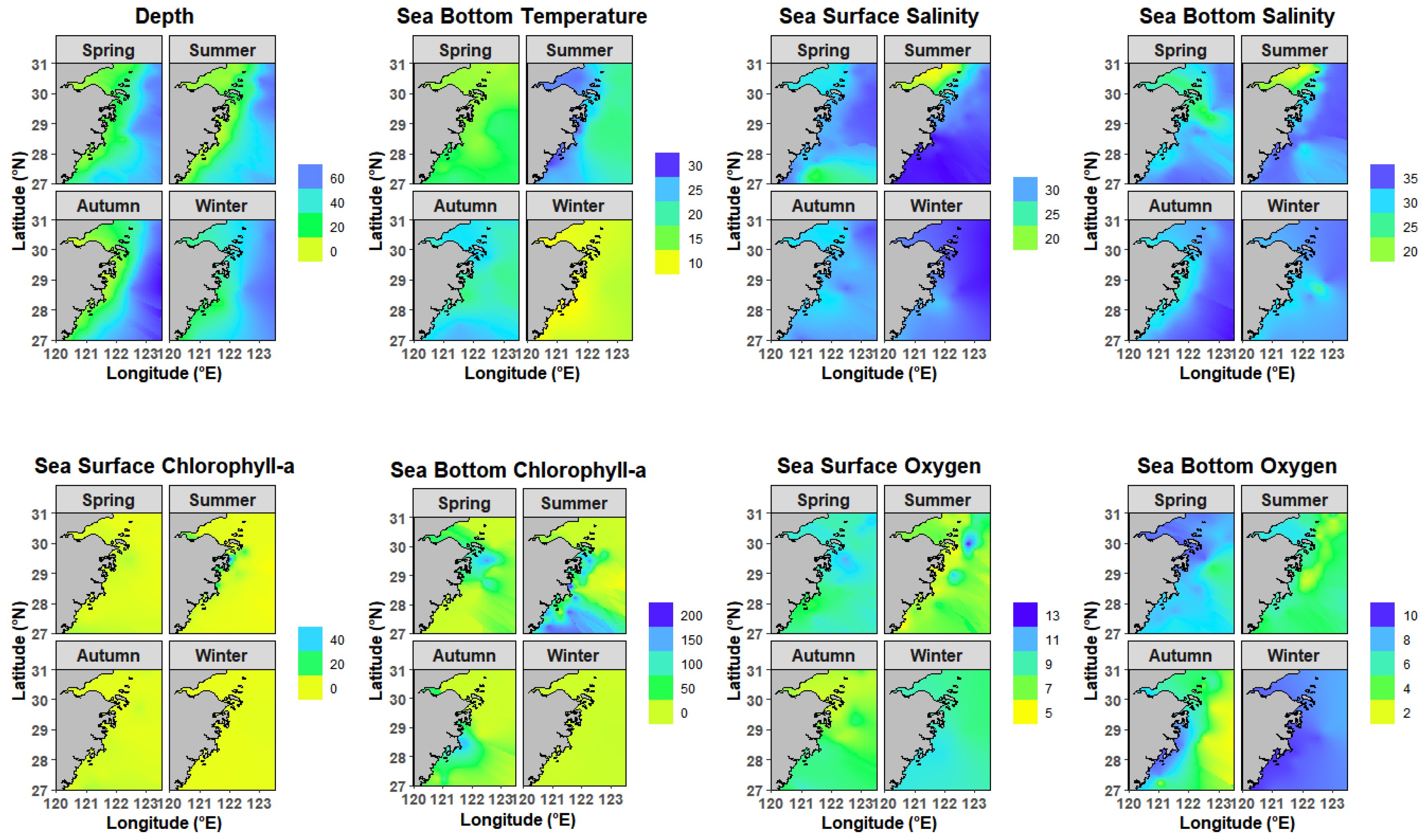 3.3. Seasonal Density Distribution of Larimichthys polyactis and Relative Importance of Environmental Factors