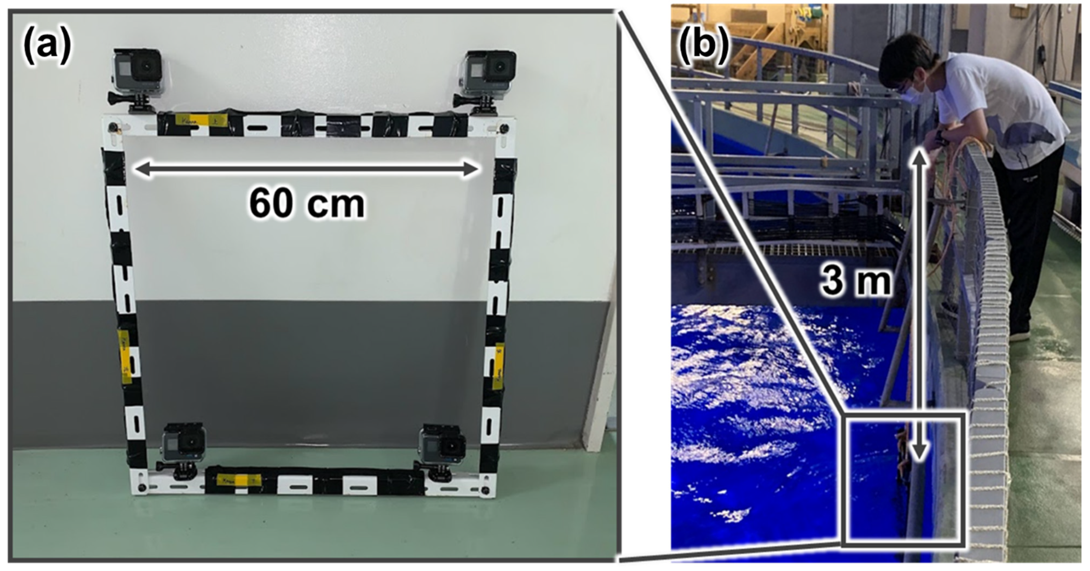 - Torisawa, S.; Komeyama, K.; Takagi, T. A Technique of Three-Dimensional Monitoring for Free-Swimming Pacific Bluefin Tuna 71hunnusOrientaliCsulturedin a Net Cage Using a Digital Stereo-Video Camera System. Fish. Eng. 2012, 49, 13–20. [Google Scholar]