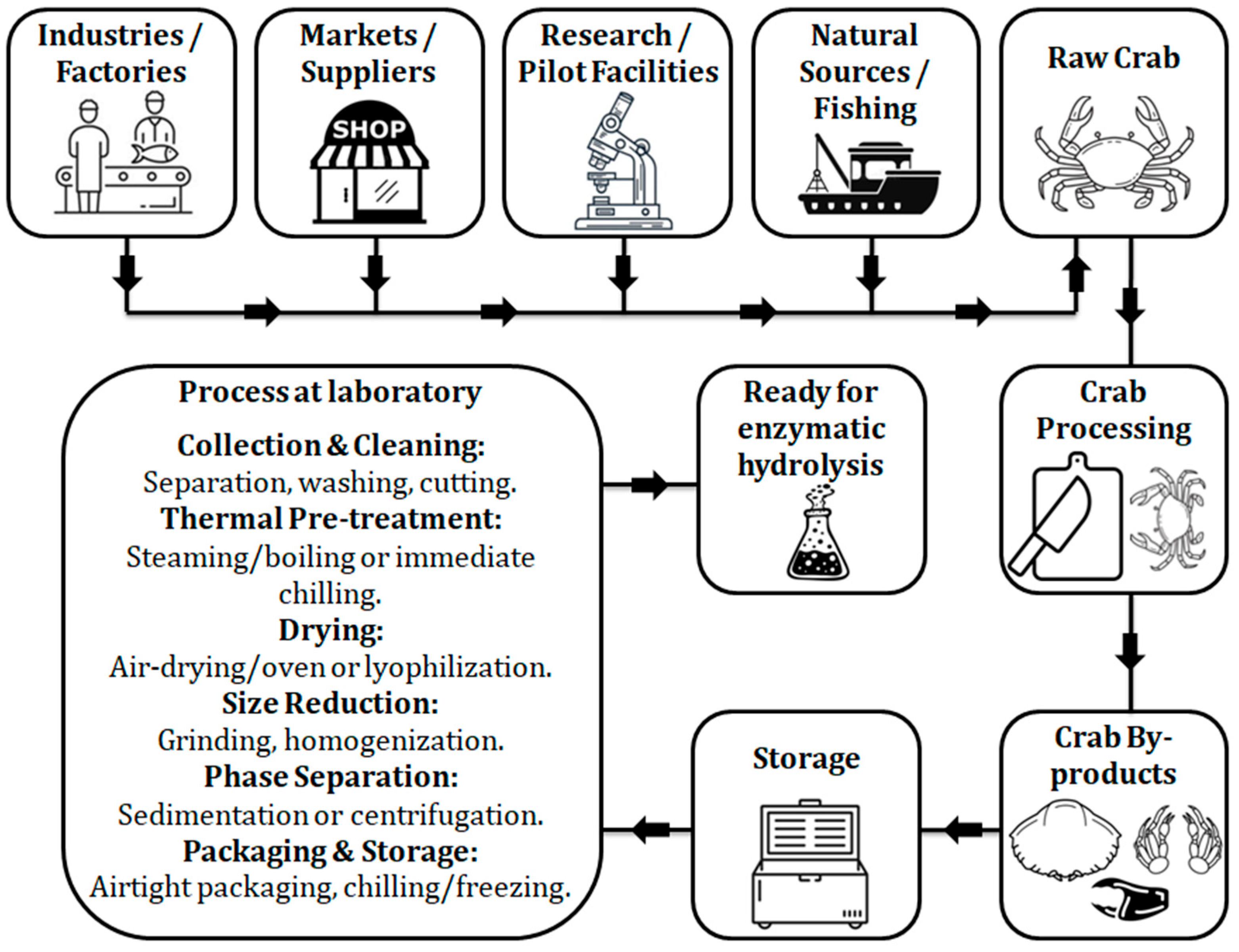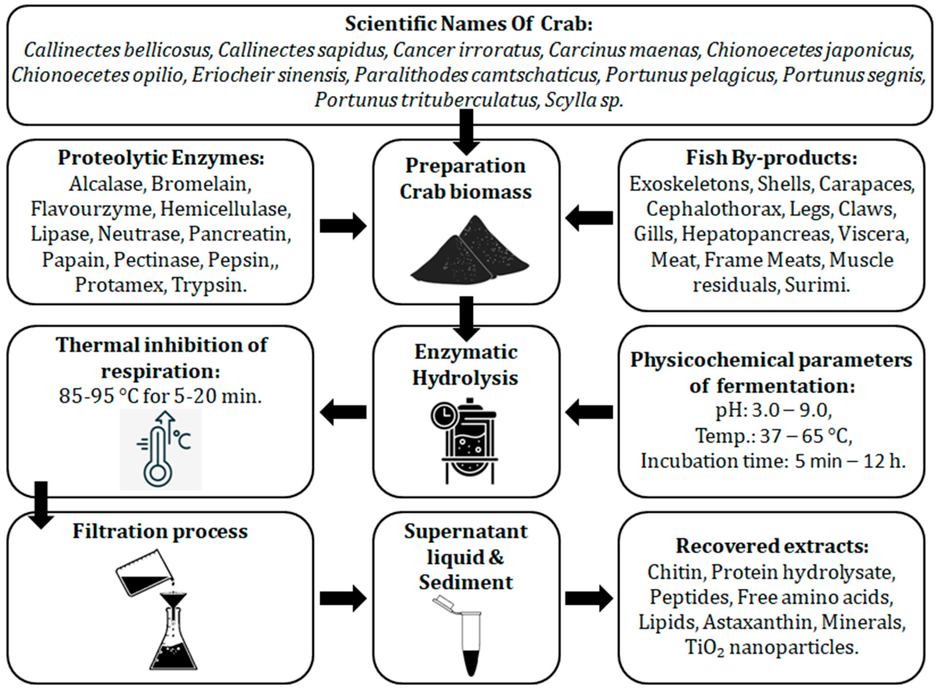 - Wang, S.; Chen, H.; Yang, S. Enzymatic processing of crustacean shell waste: Production of protein hydrolysates and chitin recovery. Bioresour. Technol. 2020, 295, 122258. [Google Scholar]