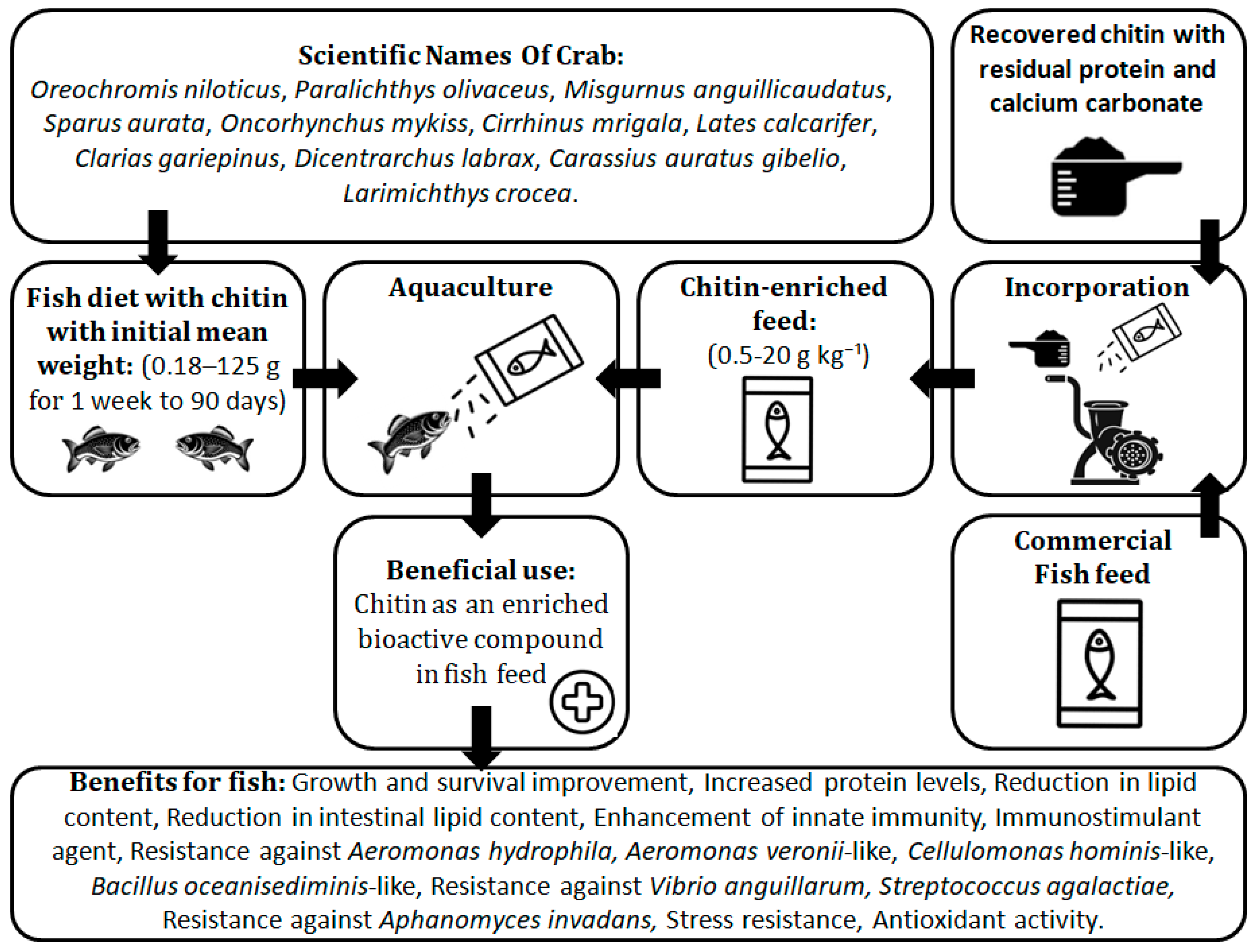 4. Description of the Production of Aquafeed with Chitin and Its Benefit to Farmed Fish