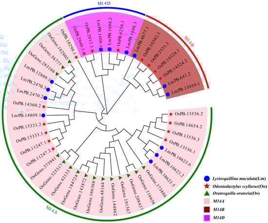 Phylogenetic analysis of 45 MCP M14 gene family sequences from three stomatopod species revealed three evolutionarily distinct subfamilies (Figure 1), namely M14A, M14B, and M14D. Notably, sequences from the same subfamily are clustered within conserved clades, even though they come from different species. The phylogenetic tree also showed that the MCP M14 gene family members of L. maculata and O. scyllarus were distributed in M14A (L. maculata: 7 sequences; O. scyllarus: 10 sequences), M14B (L. maculata: 3 sequences; O. scyllarus: 4 sequences), and M14D (L. maculata: 3 sequences; O. scyllarus: 3 sequences) subfamilies. In contrast, all 15 MCP M14 gene family sequences of O. oratoria were exclusively grouped within the M14A subfamily.
