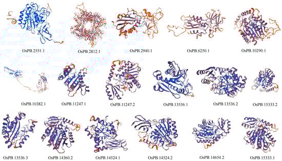 The tertiary protein structures of the MCP M14 gene family in L. maculata, O. scyllarus, and O. oratoria were constructed using SWISS-MODEL homology modeling (Figure 4, Figure 5 and Figure 6). The results show that the predicted protein and the template protein have high consistency, which means that the prediction model is reliable. Seven (including 7eqx.1.B, 1aye.1.A, 2boa.1.A, 3mn8.1.A, 2nsm.1A, 4a37.1.A, and 312n.1.A), nine (including 5om9.1.A, 7eqx.1.B, 1aye.1.A, 2boa.1.A, 1dtd.1A, 2nsm.1.A, 1uwy.1.A, 1qmu.1.A, and 312n.1.A) and five (including 7eqx.1.B, 1aye.1.A, 1kwm.2.A, 3osl.1.A, and 5mrv.1.A) models were used to predict the tertiary protein structure of the MCP M14 gene family in L. maculata, O. scyllarus and O. oratoria, respectively. The GMQE of the tertiary protein structures of the MCP M14 gene family in the three stomatopods were 0.1–0.83 (in L. maculata), 0.12–0.85 (in O. scyllarus), and 0.6–0.84 (in O. oratoria), respectively, and the QMEAN fractions were 0.42 ± 0.05 to 0.78 ± 0.05 (in L. maculata), 0.47 ± 0.05 to 0.81 ± 0.05 (in O. scyllarus), and 0.56 ± 0.06 to 0.79 ± 0.05 (in O. oratoria), respectively. This means that the model has a high degree of variability (Table 3). Additionally, our results indicated that the structural distribution presented in the tertiary protein structure of the MCP M14 gene family is consistent with the predicted secondary protein structure composition
