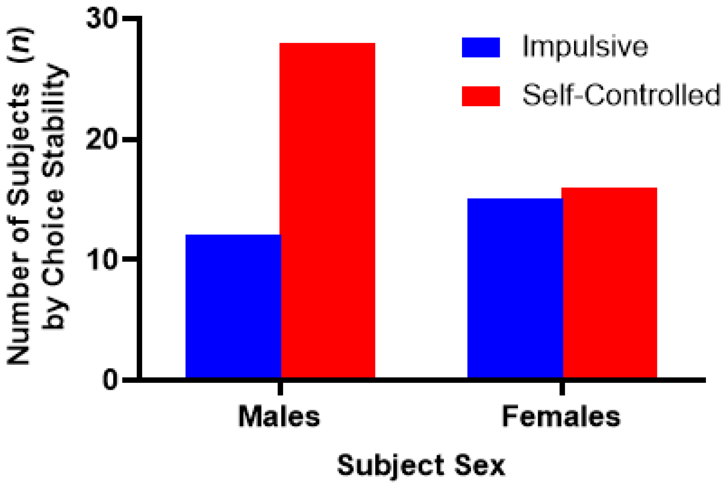 - Van Haaren, F.; Van Hest, A.; Van De Poll, N.E. Self-control in male and female rats. J. Exp. Anal. Behav. 1988, 49, 201–211. [Google Scholar] [CrossRef]