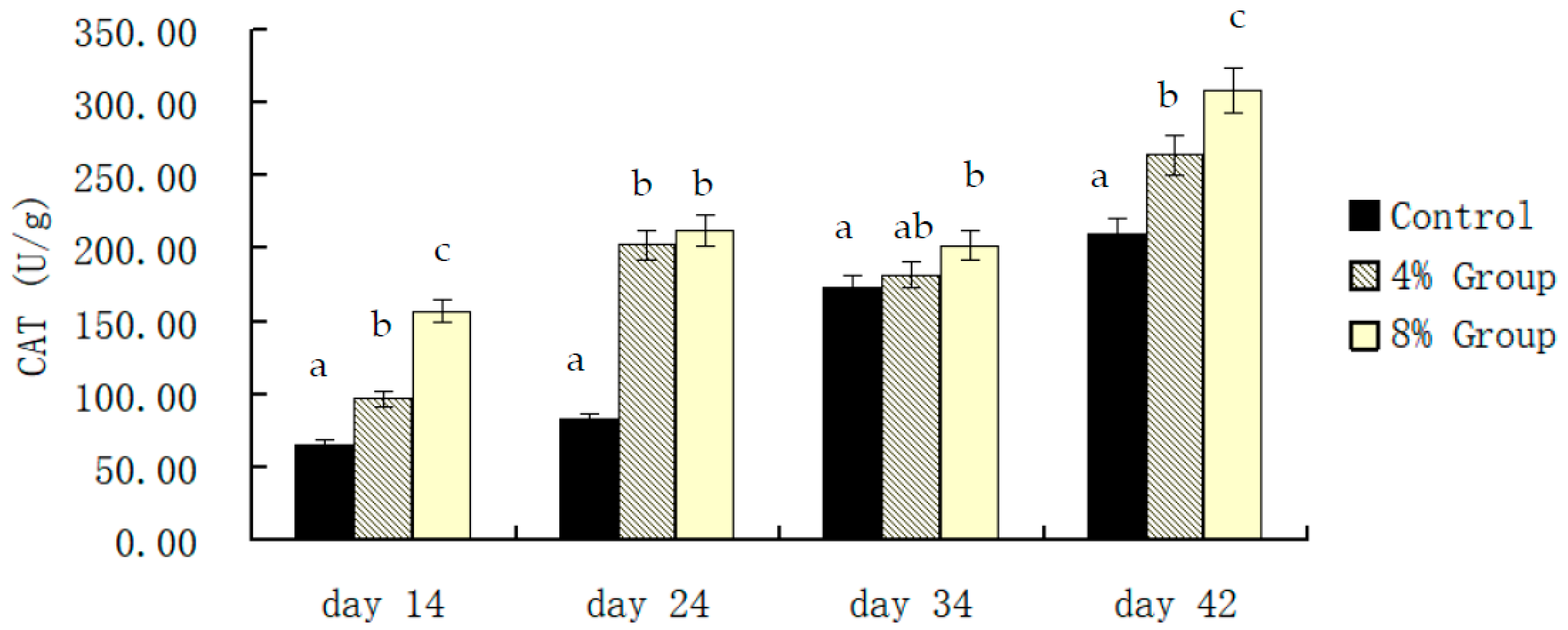 - Tang, M.; Fang, R.; Xue, J.; Yang, K.; Lu, Y. Effects of catalase on growth performance, antioxidant capacity, intestinal morphology, and microbial composition in yellow broilers. Front. Vet. Sci. 2022, 9, 802051. [Google Scholar] [CrossRef]