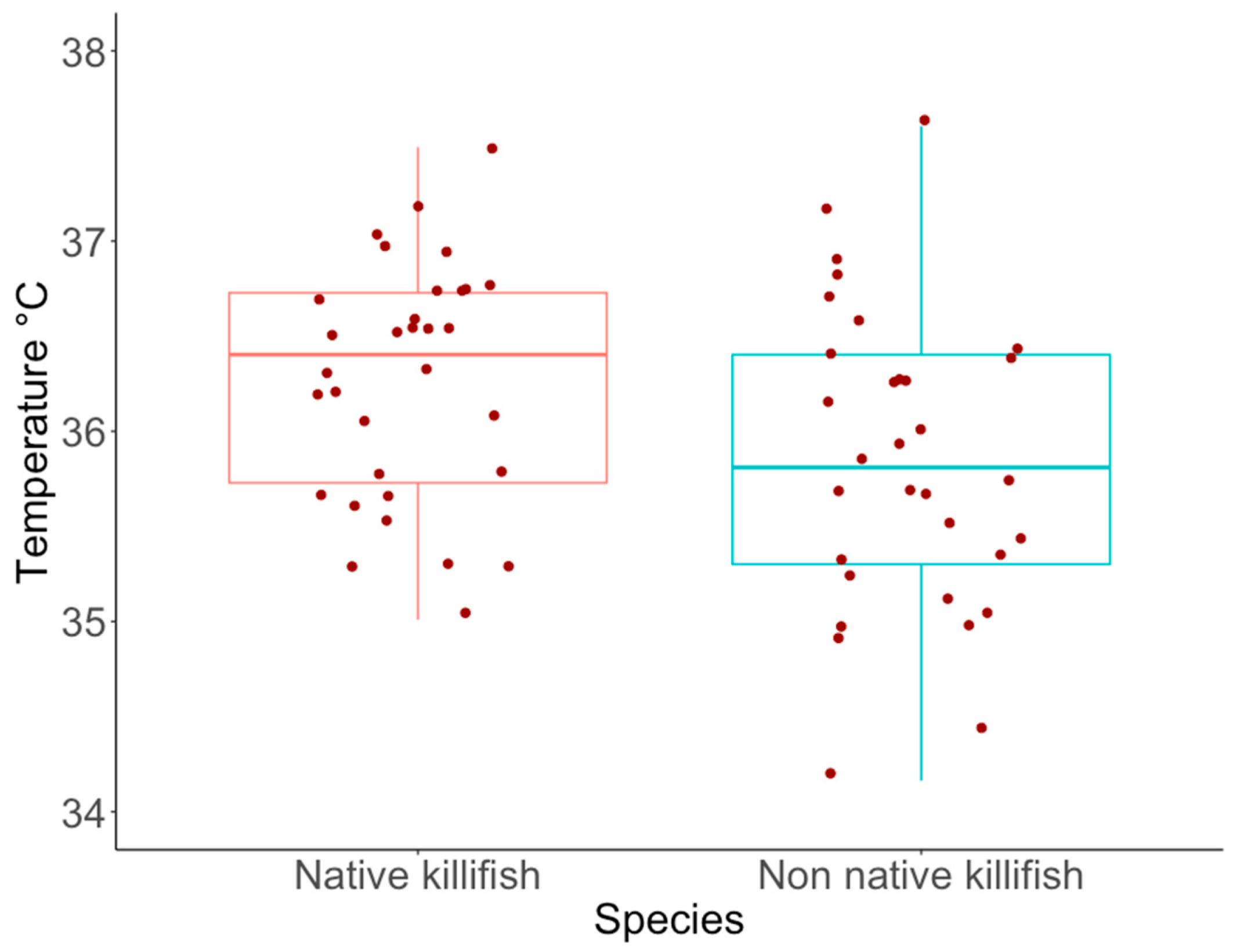 APA StyleKapakos, Y., Leris, I., Karakatsouli, N., Zimmerman, B., & Kalogianni, E. (2025). Comparative Critical Thermal and Salinity Maxima of a Threatened Freshwater Killifish and of the Global Invader Eastern Mosquitofish. Fishes, 10(10), 526. https://doi.org/10.3390/fishes10100526