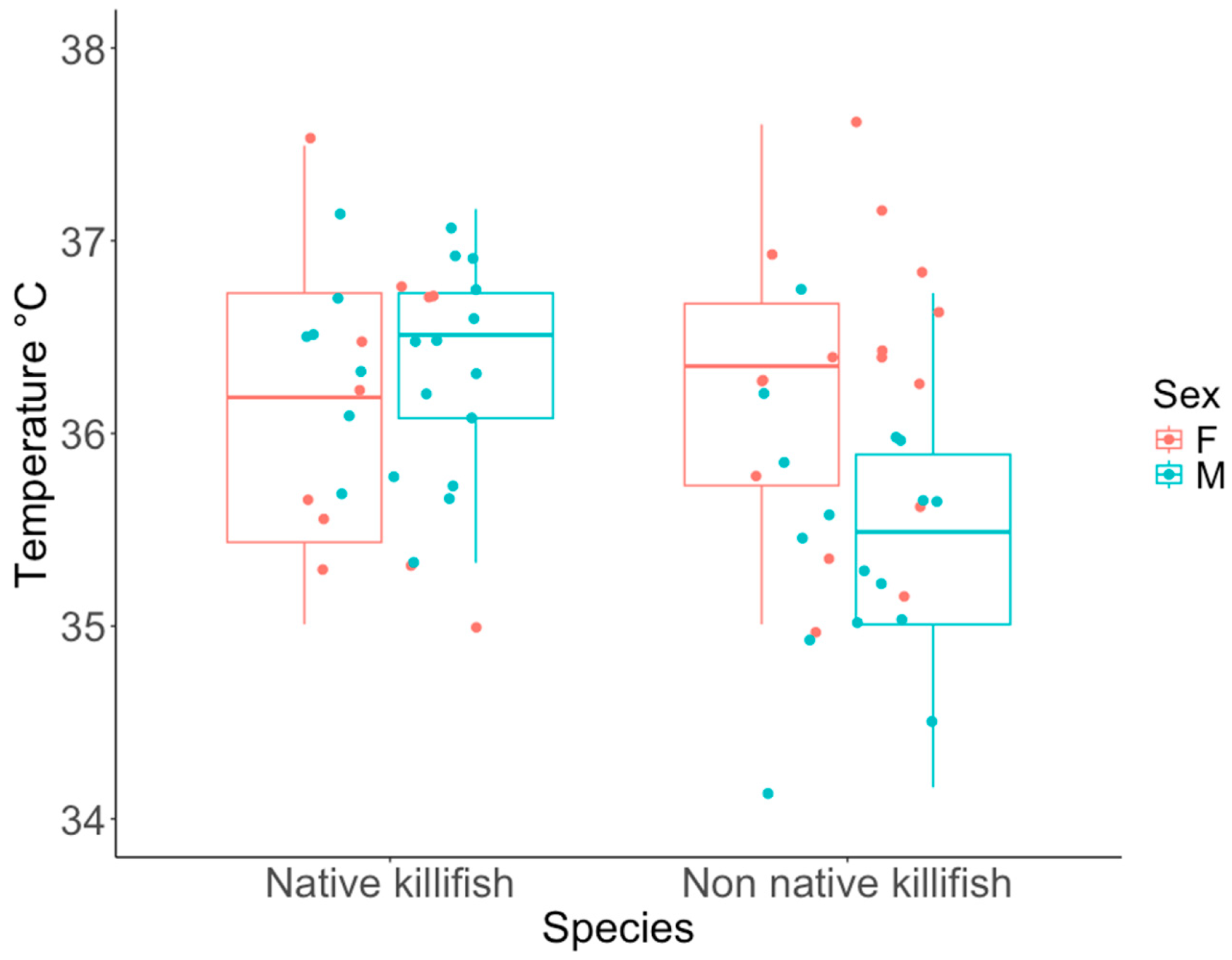 | Species (Sex) | Removal Temperature (°C ± SD) | Body Mass (g ± SD) |