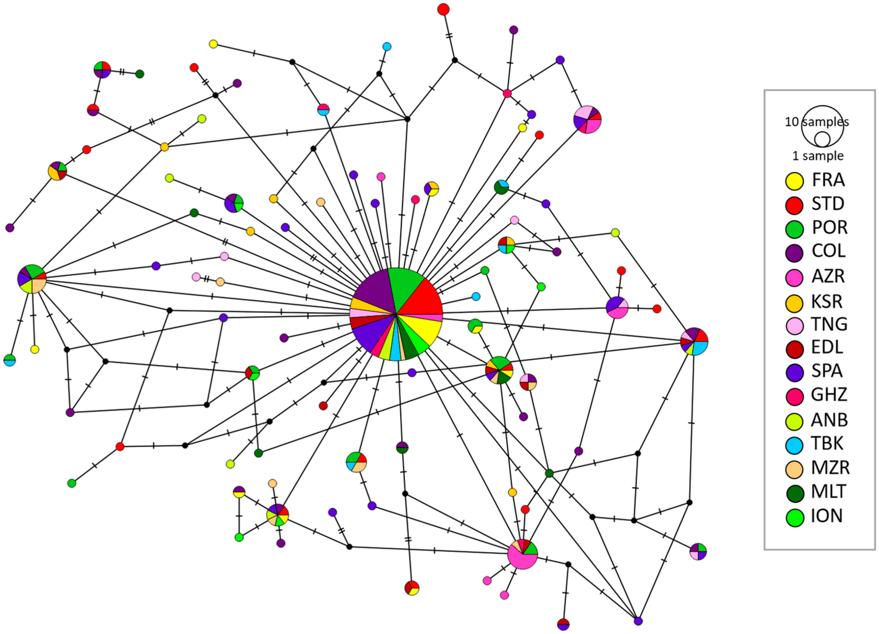 - Bandelt, H.J.; Forster, P.; Rohl, A. Median-Joining Networks for Inferring Intraspecific Phylogenies. Mol. Biol. Evol. 1999, 16, 37–48. [Google Scholar] [CrossRef]