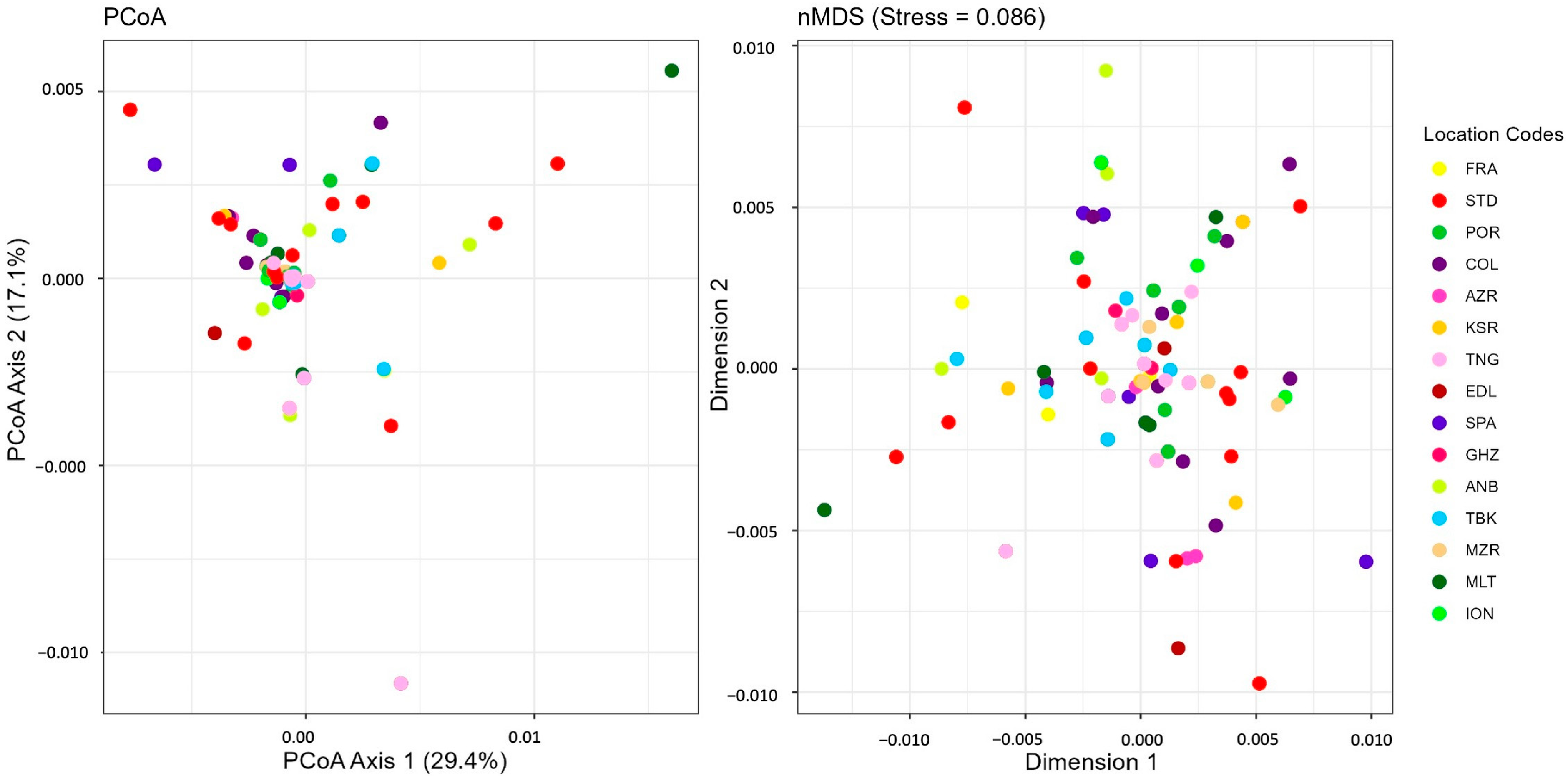 - Ferrari, A.; Spiga, M.; Rodriguez, M.D.; Fiorentino, F.; Gil-Herrera, J.; Hernandez, P.; Hidalgo, M.; Johnstone, C.; Khemiri, S.; Mokhtar-Jamaï, K.; et al. Matching an Old Marine Paradigm: Limitless Connectivity in a Deep-Water Fish over a Large Distance. Animals 2023, 13, 2691. [Google Scholar] [CrossRef] [PubMed]